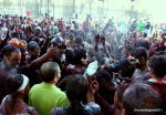 …En la Estación nos esperan los accitanos con sus pinturas de agua, almagra y azulete, con los que volver a manchar al «Cascamorras» en represalia de su fracaso. Desde los balconesde los edificos que flanquean las calles del recorrido le lanzan cubos de agua con pintura, al unísono grito de aquellos que realizan la carrera de «¡agua!, ¡agua!, ¡agua!,…». También aquí hay preceptivos baños, como por ejemplo el que reciben los asistentes a la carrera donde están situados los dos coches-cubas de los bomberos. Al llegar al puente del Rio Verde se realiza parada obligatoria. «Cascamorras» «baila» la bandera sobre las cabezas de los accitanos.